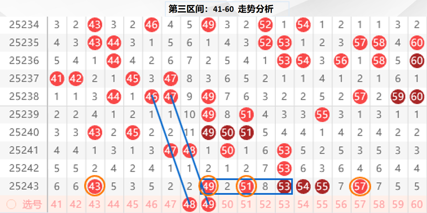 三区分析:【41-60】(走势图标注号码非小黄车大底,请谨慎参考,具体思路将在直播间分享讨论)