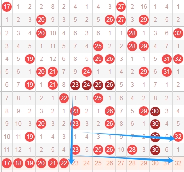 上图是福彩快乐8开奖号码中第二个区域分布走势图,我在上图中标注出来的数字是我觉得可以关注的,你们看蓝色箭头就会发现这个区域的号码右边出号码比较多,那么本期可以关注左边的数字,可以关注17 18 19 20 21 22出2个或者3个。整体来看这个区域,最近几期这个区域出号码多,本期这个区域最多看出3个数字。