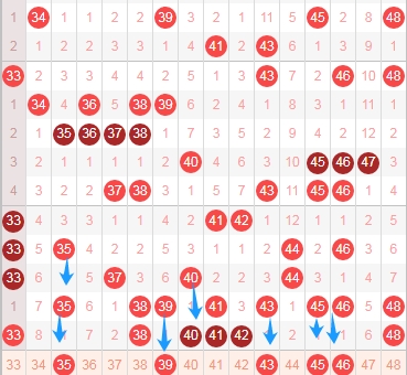 上图是福彩快乐8开奖号码中第三个区域分布走势图,我在上图中标注出来的数字是我觉得可以关注的,最近这个区域出号码比较多,你们仔细看最近两期开出的号码就知道。本期可以关注数字35 39 43 45 46关注这些隔一期的数字出1个或者2个,这个区域本人觉得可以关注出2个或者3个。