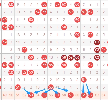 上图是福彩快乐8开奖号码中第四个区域分布走势图,我在上图中标注出来的数字是我觉得可以关注的。看我画出的蓝色小箭头表示的最近号码的特点,上期出现了数字51,数字56那么本期要关注这两个数字附近的数字,同理上上期数字61附近的数字也可以关注,关注数字53 55 57 59 61 62出2个或者3个。