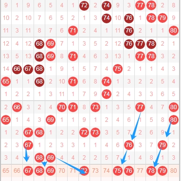 上图是福彩快乐8开奖号码中第五个区域分布走势图,我在上图中标注出来的数字是我觉得可以关注的。上上期出现数字76和数字79上期这两个数字附近没出现号码,本期关注这两个数字附近出号码,关注75 76 78 79出1个或者2个。同理上期出现了68 69本期可以关注67 68 69 72出2个或者3个。