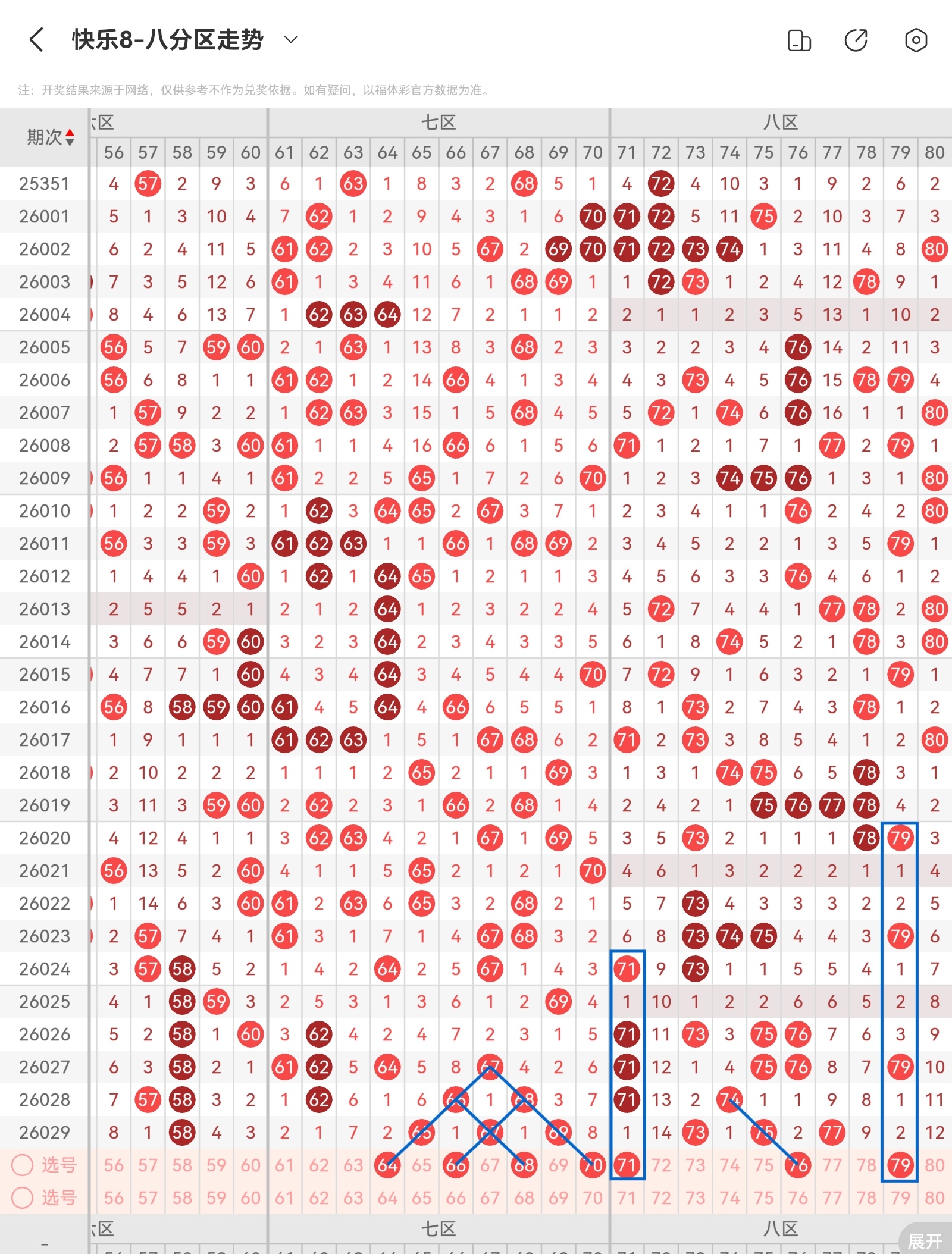 四区间上期(26029期)开出了六码,区间整体走出了热态出号形势,前区〔61-70〕开出了三码(65 67 69)开出了分边号码,本期做号需要注意斜连走势号码能否开出,以及空白区域号码回补落码,后区〔71-80〕开出了三码(73 75 77)开出了分边号码和独码,本期做号需要注意斜连走势号码能否开出,以及独码位置能否有落码和空白区域号码回补落码,区间由温态走出热态出号形势后,本期大概会是温态出号形势,号码个数预计五个左右,个人看好【64 66 68 70 71 76 79】重点关注【64 68 71 76 79】