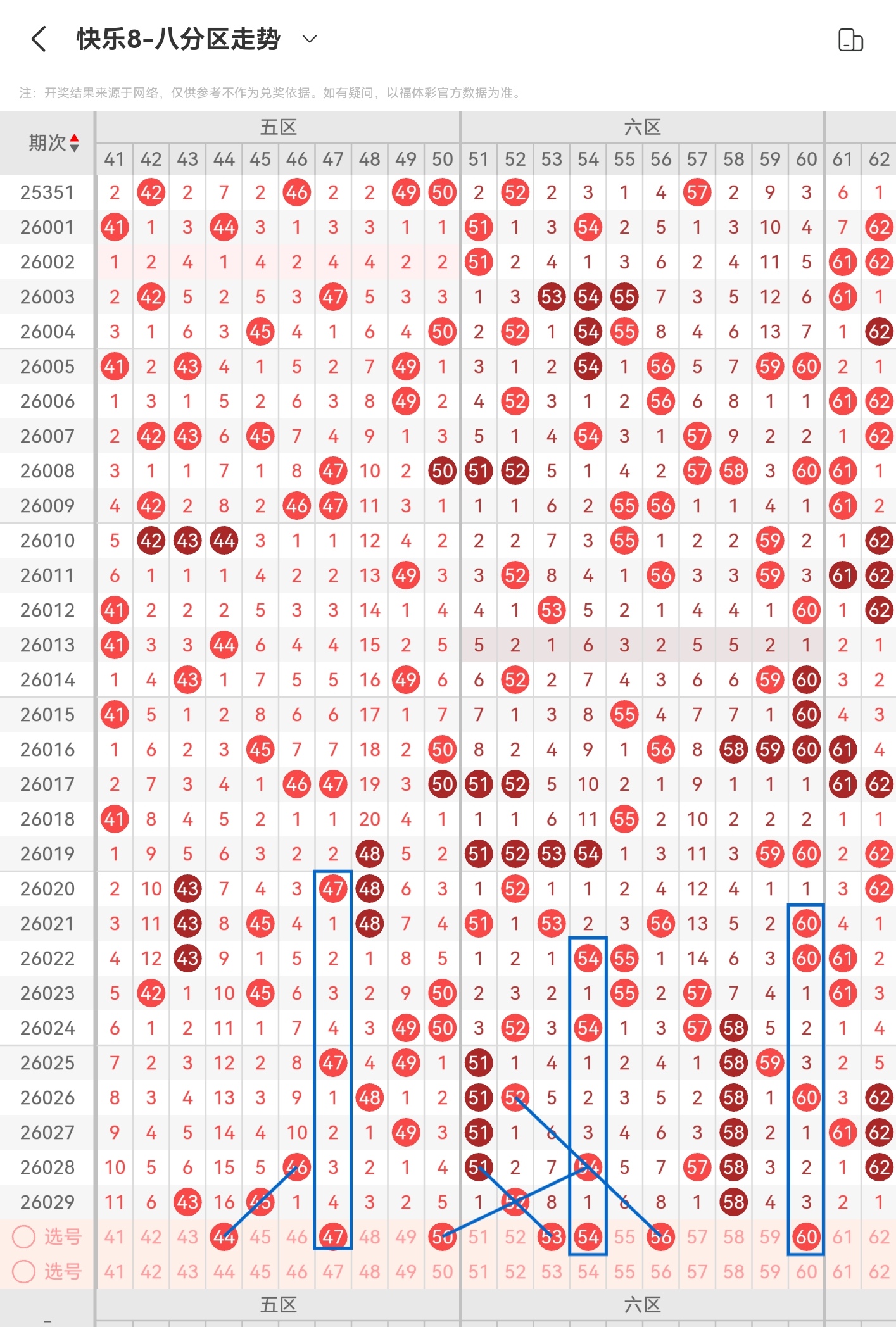 三区间上期(26029期)开出了四码,区间整体走出了冷态出号形势,前区〔41-50〕开出了两码(43 45)开出了独码和分边号码,本期做号需要注意斜连走势号码能否开出,以及独码位置能否有落码和空白区域号码回补落码,后区〔51-60〕开出了两码(52 58)开出了分边号码和重号,本期做号需要注意重号和斜连走势号码能否开出,以及空白区域号码回补落码,区间由温态走出冷态出号形势后,本期大概会是温态出号形势,号码个数预计五个左右,个人看好【44 47 50 53 54 56 60】重点关注【44 47 50 54 60】