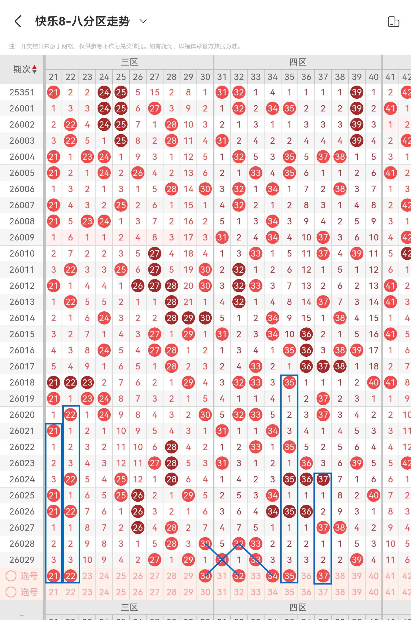 二区间上期(26029期)开出了五码,区间整体走出了温态出号形势,前区〔21-30〕开出了两码(27 29)开出了分边号码,本期做号需要注意斜连走势号码能否开出,以及空白区域号码回补落码,后区〔31-40〕开出了三码(31 33 39)开出了夹号和重号和独码,本期做号需要注意重号和斜连走势号码能否开出,以及独码位置能否有落码和空白区域号码回补落码,区间由冷态走出温态出号形势后,本期大概会是温态出号形势,号码个数预计五个左右,个人看好【21 22 30 32 34 35 37】重点关注【21 22 34 35 37】