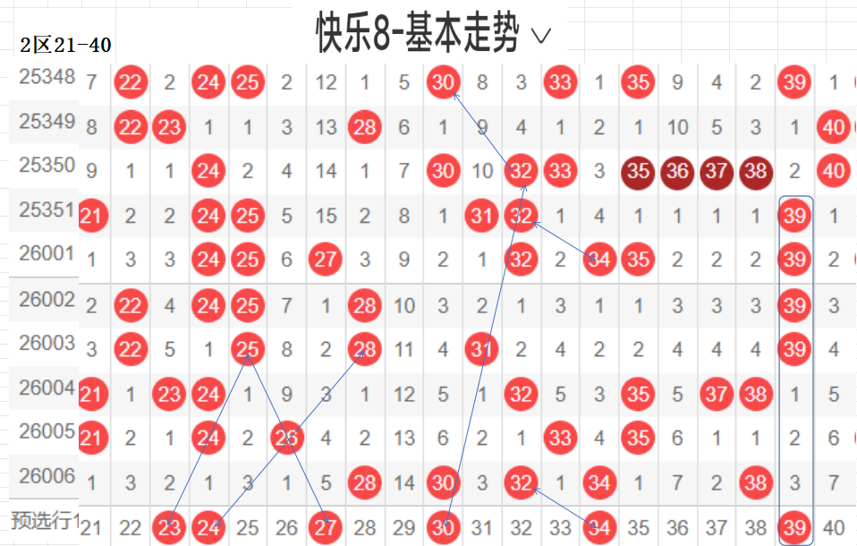 二区(21-40):遗漏5期以下有17个,0码28 30 32 34 38 5个,数据所示,冷码平均,选择条件增多了.上期开出了5个号码,出码比较分散.这期布防相应增加,重码按比例落这区较少,先给出关联码24,这个区间间接走势,温区,21-30区间上期开了2个,依旧不是重点选号区间,31-40区间开出3个,本期关注热码的回补,间隔小遗漏值最佳,3字头转热,这个小区热码注意回调,可以做关联码的布局,注重温冷码的回补.