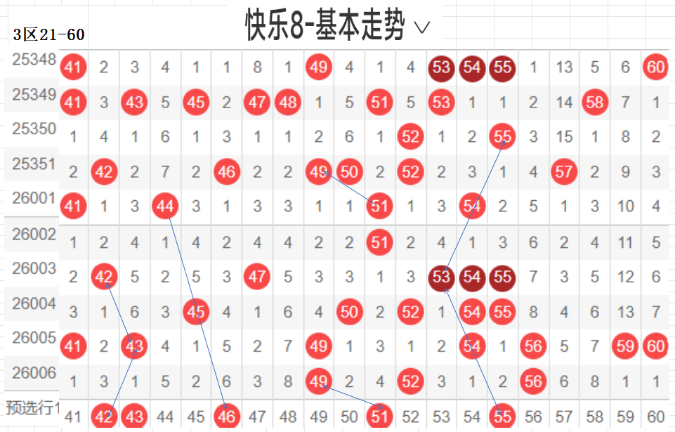 三区(41-60):遗漏5期以下有16码,0码49 52 56 3个,温开方式,这区码数有回暖之意,可以防一手,先定胆码走势较大者,隔期,斜三连,分边号码,可重防,间隔5期以上号码可以随走势选取,例如本期大冷码,走势比较大,可以做胆,通常联动可带出,分边对称的号码,本区间也有很大走势.可关注下.隐形夹角号码.做补位形态号码.都需要观察动态走势.以上是本区间的选码方法.