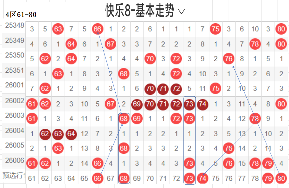 四区:(61-80):遗漏5期(含5)以下有18码,0码61 62 66 73 76 78 79 3个,平均温开方式,上期开出7码,区间回暖,后区可防,四区间从以往数据来看,重码很强,一枝独秀的存在,近期有回补走热的趋势,区间回暖后,本区间后区可防,与一区相比,也是温区.,对称下落码,隔期回补码,可以防守,这区对呈对称三角关系的胆码,斜三连有走势的胆码,联动落位码,都有各自的走向落位关系,根据走势选择一种方式选码.