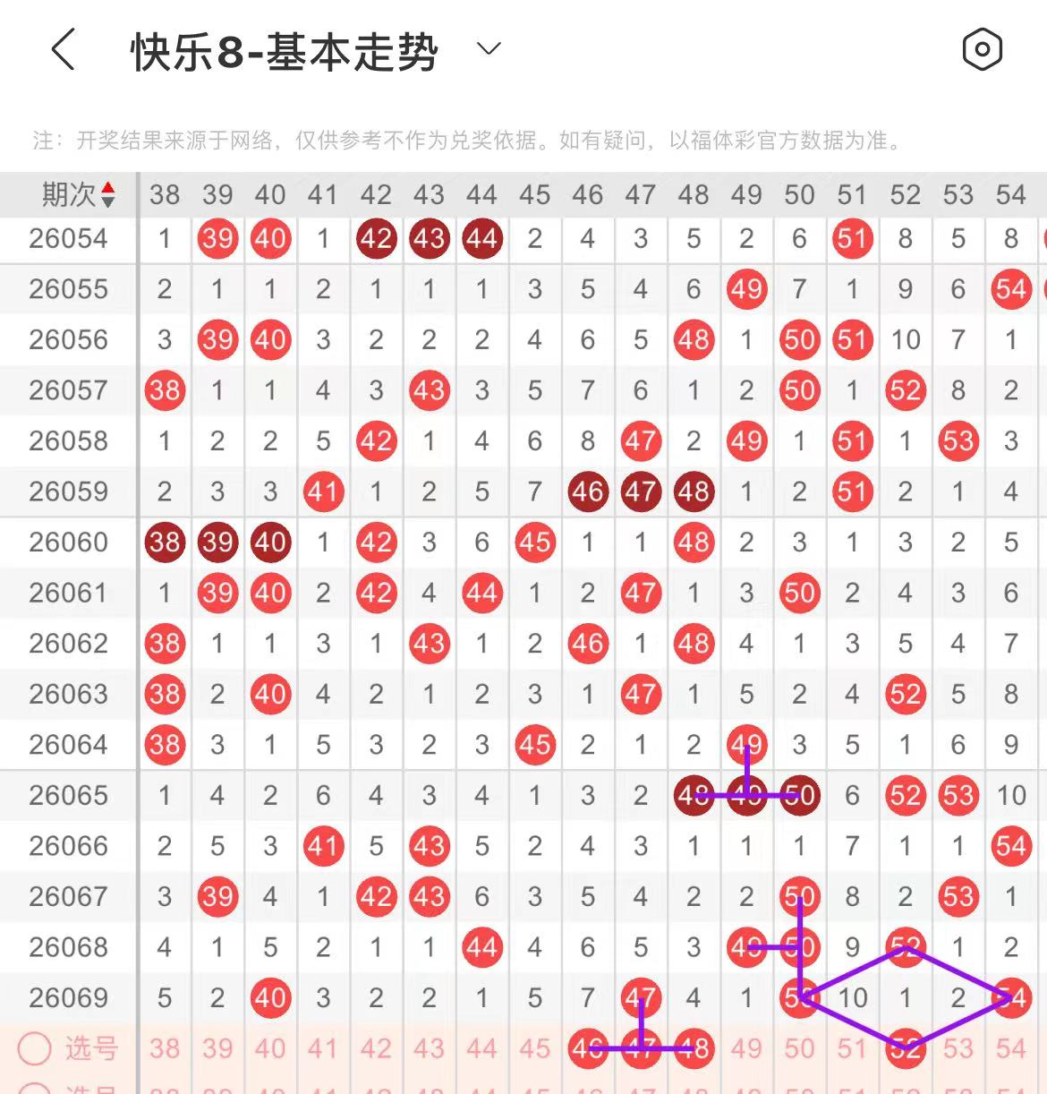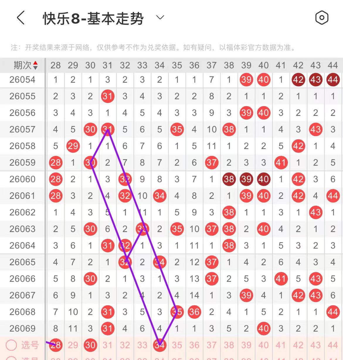 31-40区:本区间上期开出了两个号码,从号码走势图上看,该区现属于温冷区,出号个数不稳定,在选号上建议以防为主。本期有出号走势的号码有34号,平行斜连出号走势,后半区可防范38号,40对应38出号走势。
