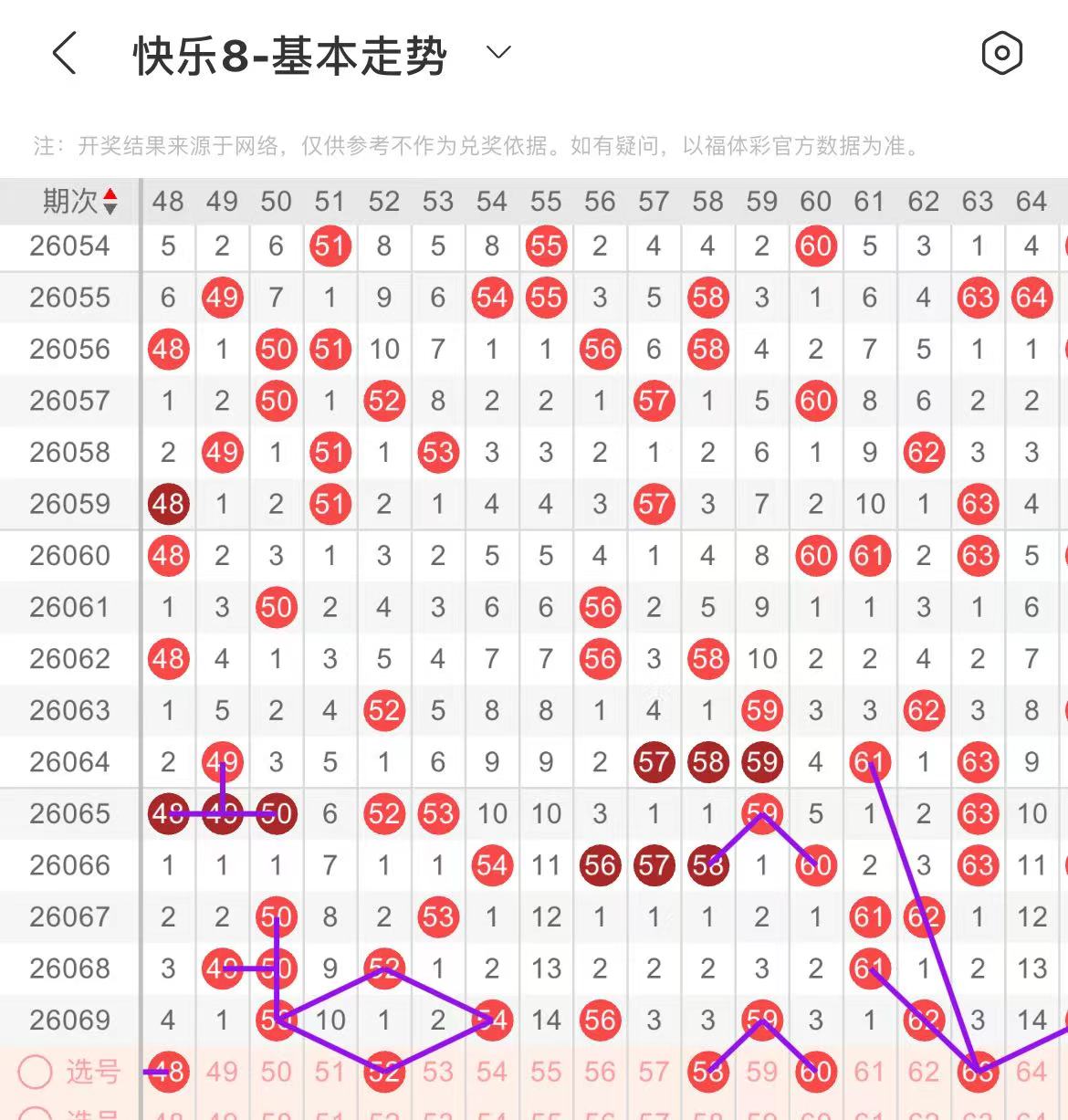 51-60区:本区间上期开出了三个号码,从号码走势图上看,本期出号个数在三个号码左右,区头区尾均有号码回补,有出号走势的号码有52号,形成一个菱形走势形态,58.60号,做分边出号考虑。