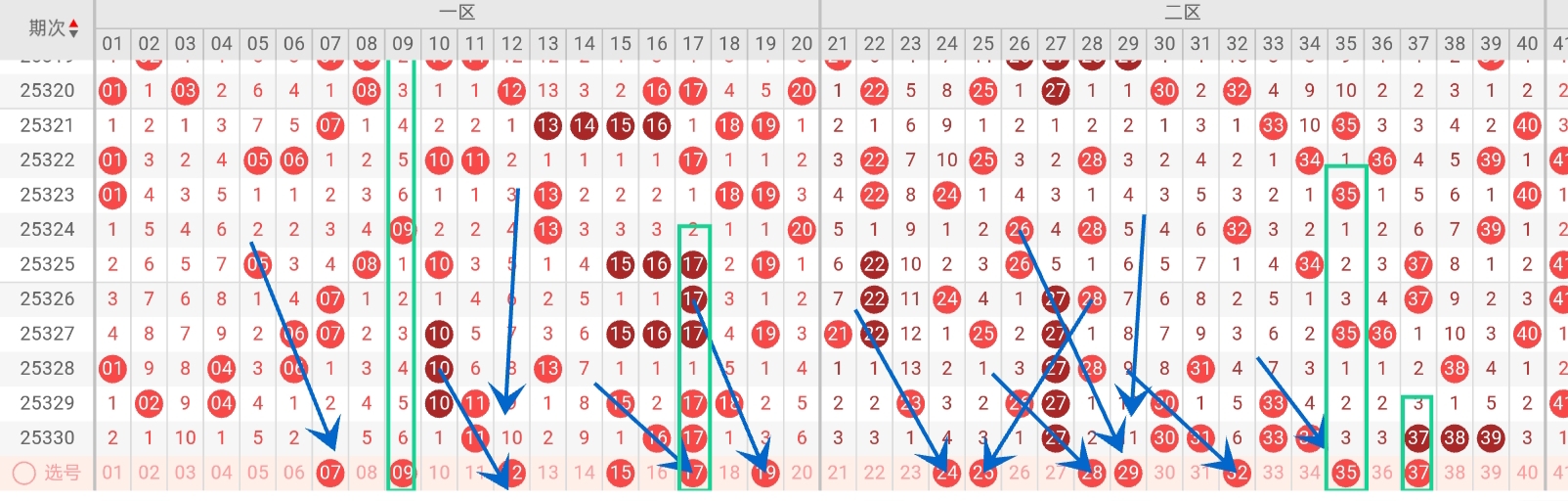 二区上期开出27-30-31-33-34-37-38-39,共8个号码,本期大家可以根据尾数、隔期码、以及边码走势情况,本期首先需看29相邻码、30会再出现;上期27-39区间开出密集号,本期37出号机会比较大,本期二区有连续号28-29-30预测会出,上期龙头27,凤尾39,本期预测龙头24、凤尾37,本二区间建议大家关注号码29会出,再根据号码走势预防连续号28-29预测会出。综合分析筛选,本期二区推荐:24-28-29-30-35-37