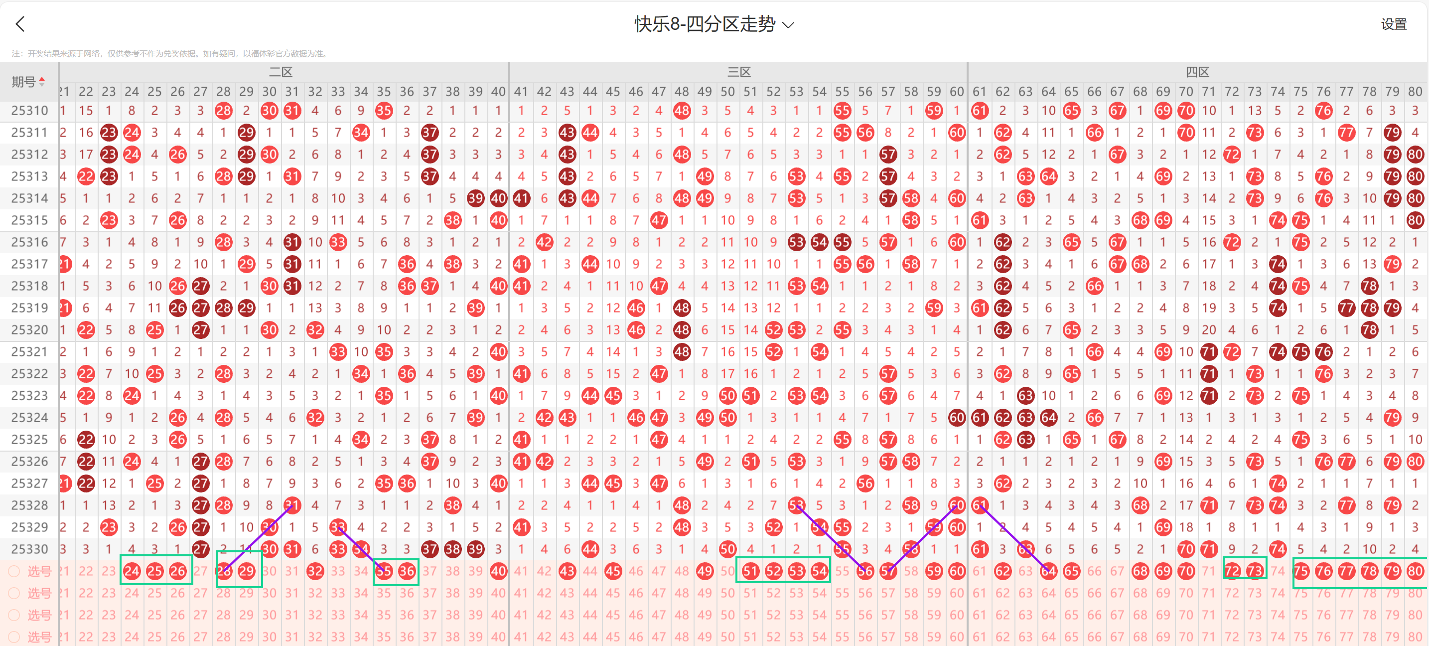 第2025331期福彩快乐8通过以下走势图及一二区间预测分析如下:
