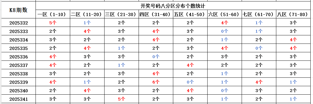 首先看上期回顾,“快乐8”第25341期开奖结果:4.8.9.11.15.19.21.23.24.25.26.37.38.43.45.46.52.63.64.74;通过分析开奖号码,分享第一个数据分析:统计开奖号码的八分区冷热走势,判断出号规律。以近10期开奖号码的八分区统计数据为例: