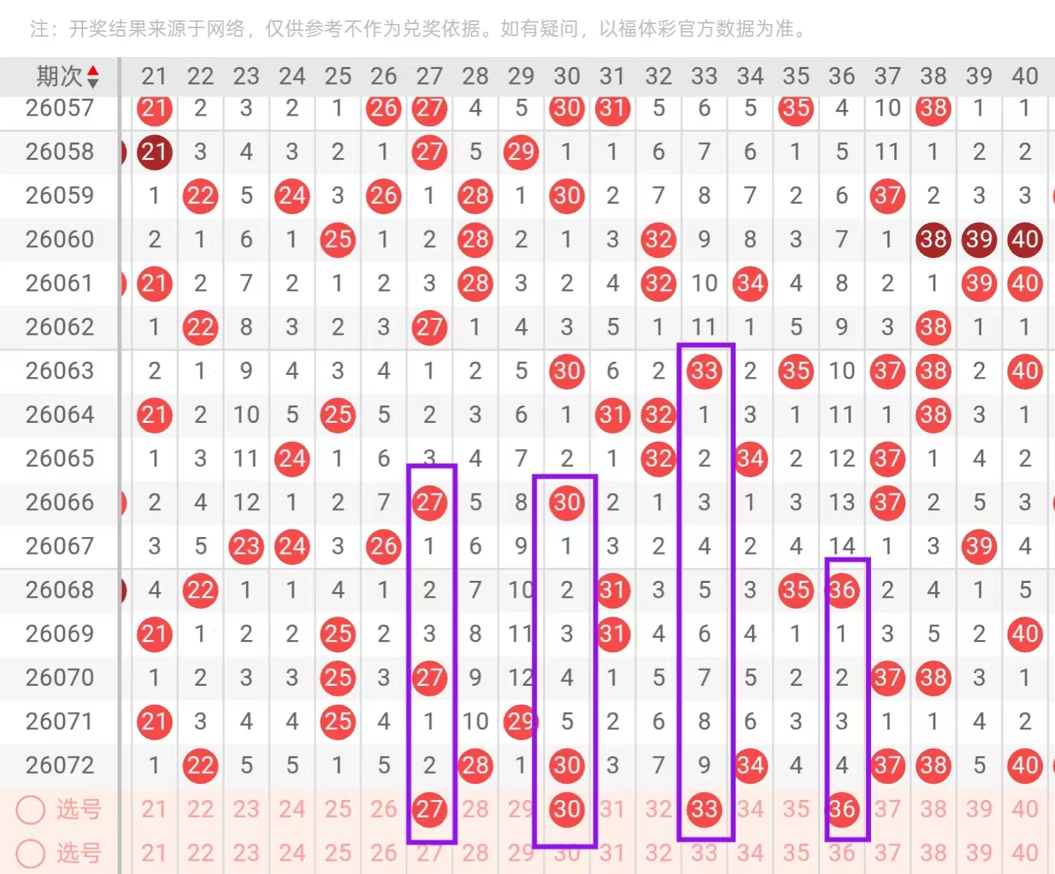 二区21-40:二区间,上一期出现了大面积的回补,总体回补了7个号码的下落,从二区间近期号码下落点位来看,呈现出了由冷转热的形态,今天我们要重点关注的是二区间空缺位置的下落和对子下面的回补,在2头首先我们要重点关注的是23-24对子控5的一个回补形态,和27-30的一个下落点位,今天这里可用23-30,和27-31的一个搭配回补,回到三头位置,这里值得我们重点关注的是33-36的一个下落点位,和39-40的一个回补点位,今天这里可用33-39和36-40的一个搭配回补。