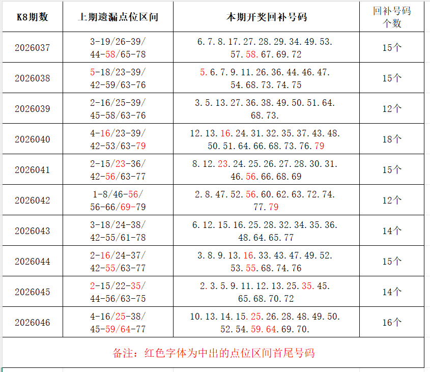 如图,上期的遗漏号码在下期开出10个左右,即为回补号码。定准点位区间首尾号码是关键!以上期2026046期为例,定位4个遗漏区间,围中16码!结合上期开奖号码,以跨度值大于或等于7为依据,本期关注4个遗漏区间:1-10/15-23/28-48/70-79;重点关注遗漏区间:2-16/24-39/45-58/60-75。点位区间号码和大底号码请勿混淆,个人分析,仅供参考。