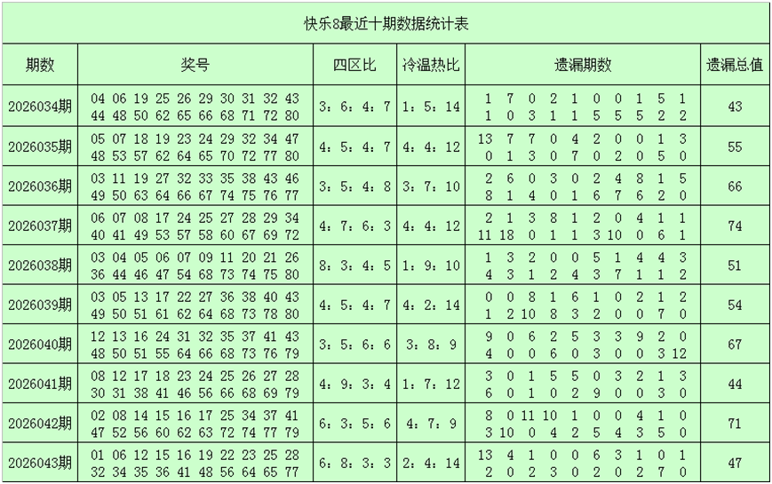 一、快乐8第2026044期奖号分析(定义:遗漏0-2期号码为热码,遗漏3-6期号码为温码,遗漏7期及7期以上号码为冷码,重码为上期开出奖号,邻码为上期没有出现,但与上期奖号差值为1的号码,例如上期开出奖号04,没有出现号码03和05,则本期03和05都为邻码,其它则为孤码。