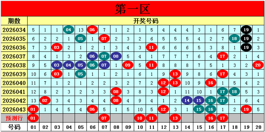 目前第一区包含11个热码:重码6个01、06、12、15、16、19,邻码4个02、14、17、18,孤码1个08;包含8个温码:邻码5个05、07、11、13、20,孤码3个03、04、09;包含1个冷码:邻码0个,孤码1个10;号码冷温热个数比为1:8:11,重号、邻码、孤码个数比为6:9:5。