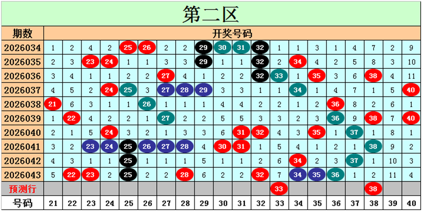 目前第二区包含15个热码:重码8个22、23、25、28、32、34、35、36,邻码5个24、26、27、31、37,孤码2个30、38;包含3个温码:邻码3个21、29、40,孤码0个;包含2个冷码:邻码1个33,孤码1个39;号码冷温热个数比为2:3:15,重号、邻码、孤码个数比为8:9:3。