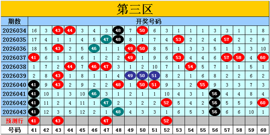 目前第三区包含7个热码:重码3个41、48、56,邻码1个47,孤码3个46、52、60;包含10个温码:邻码3个49、55、57,孤码7个43、44、50、51、53、54、58;包含3个冷码:邻码1个42,孤码2个45、59;号码冷温热个数比为3:10:7,重号、邻码、孤码个数比为3:5:12。