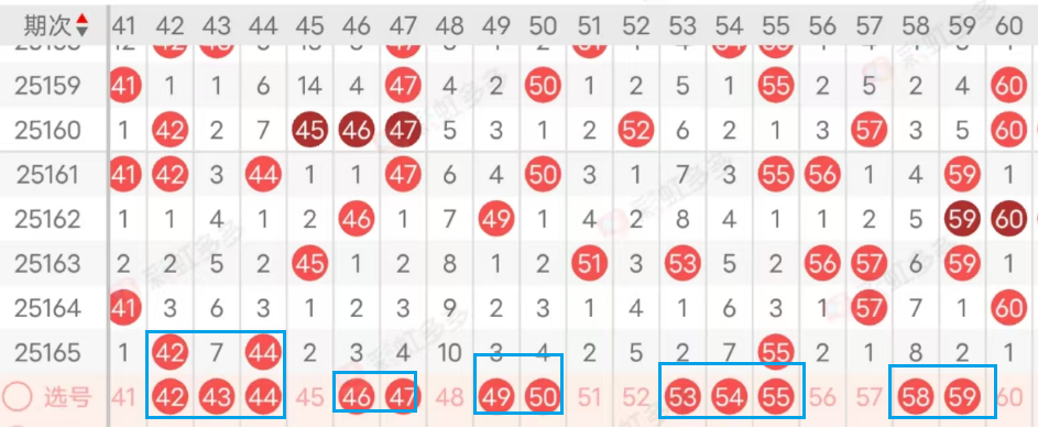第三区间的走势分析:第三区间上期开出了三个号码球!主要的落号点位在前半区的龙头和后半区的中间位置。根据三区间的走势规律!今天的三区间方向一首先关注42 44这两个号码球点位的落号!防守有一码走重同时拉下它们的边码41 43 45 。方向二主看后半区55这个号码球点位的落号!注意55有继续走重的可能!如果不走重主看他的分边码53 54 57 58 59这几个号码球!方向三主看44-55之间号码的落位!如果44 55同时走重!它们之间号码的落位就不多!如果不走重!主看46 47 48 49 50这几个号码球,应该有2码落下。