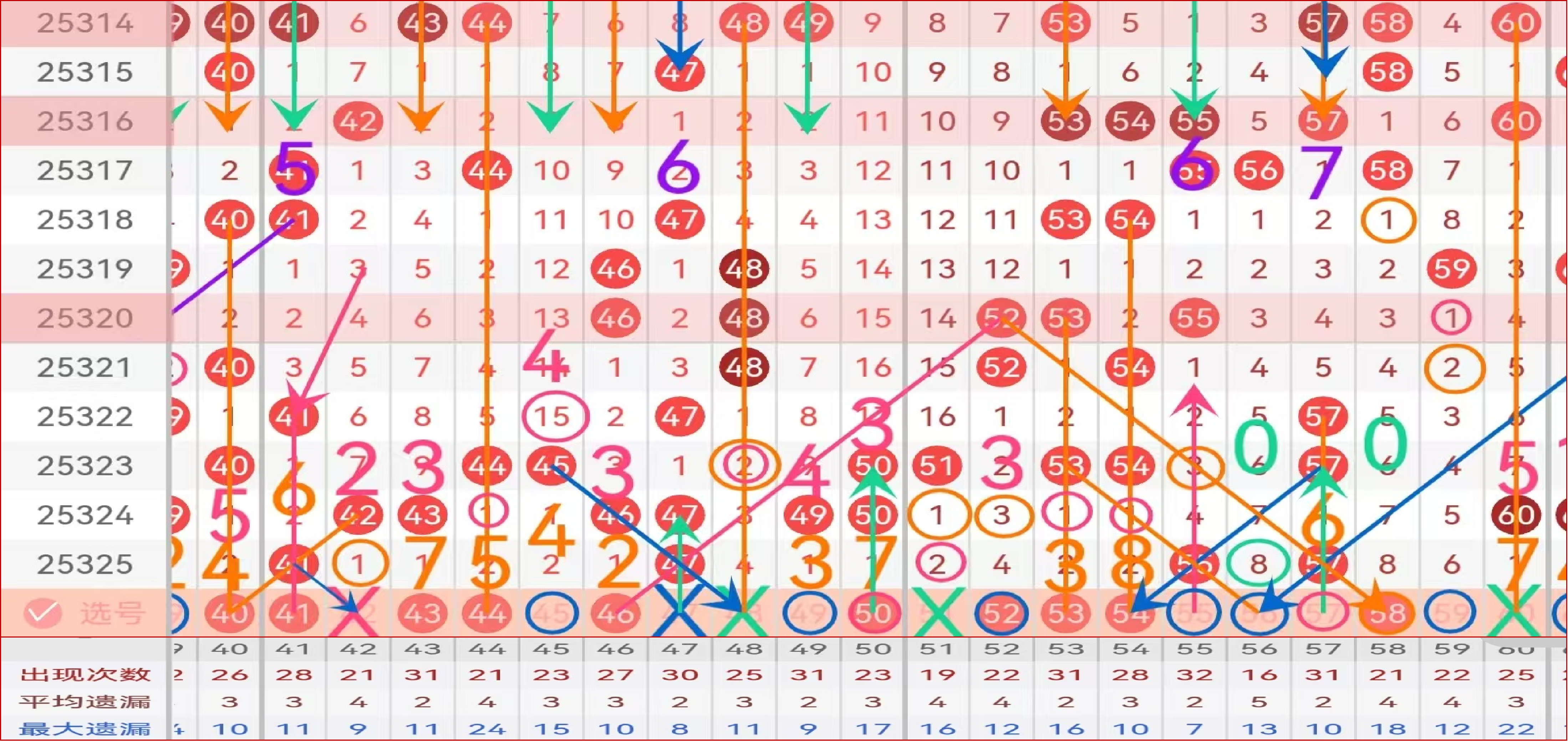 区间推荐主做号码41 43 44 46 50 52 53 54 58  防守号码45 49 55 57;