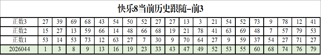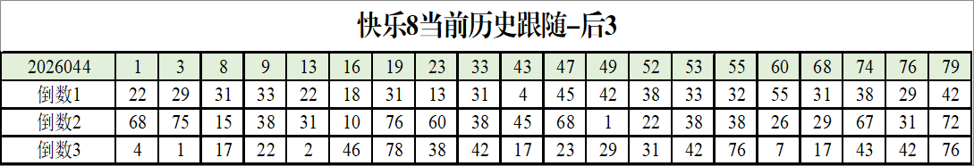 我感觉选热的同时,还要注意防冷条件开出,可以直接选取每个号码跟随出次前三的号码,也可以考虑把出次最后的三个数字加进去,不过这样可能号码太多,可以尝试。图上也能看出单独号码跟随的情况,我就不一一统计每个号码的出次了,我这里考虑提高概率,取每个号码历史跟随的前三号码和后三号码,根据2026044期的号码,我关注正数3和倒数3的号码号码为: