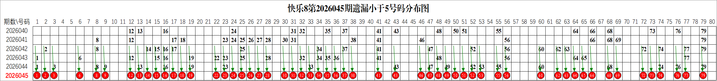 所以这个条件值得关注,从号码分布图上我们可以分析出,遗漏小于5期的号码有: