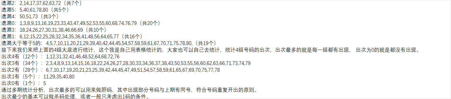 如果把对数和补数合起来有40个号码,中间可能还会产生一下重复数,通过近几期的统计分析,以上期数据进行补数对数计算推算下一期的概率不高。为提高概率,我主要是用前两期的数据来进行对数补数推算,然后再组成一个集合,作为我的第四组大底号码。