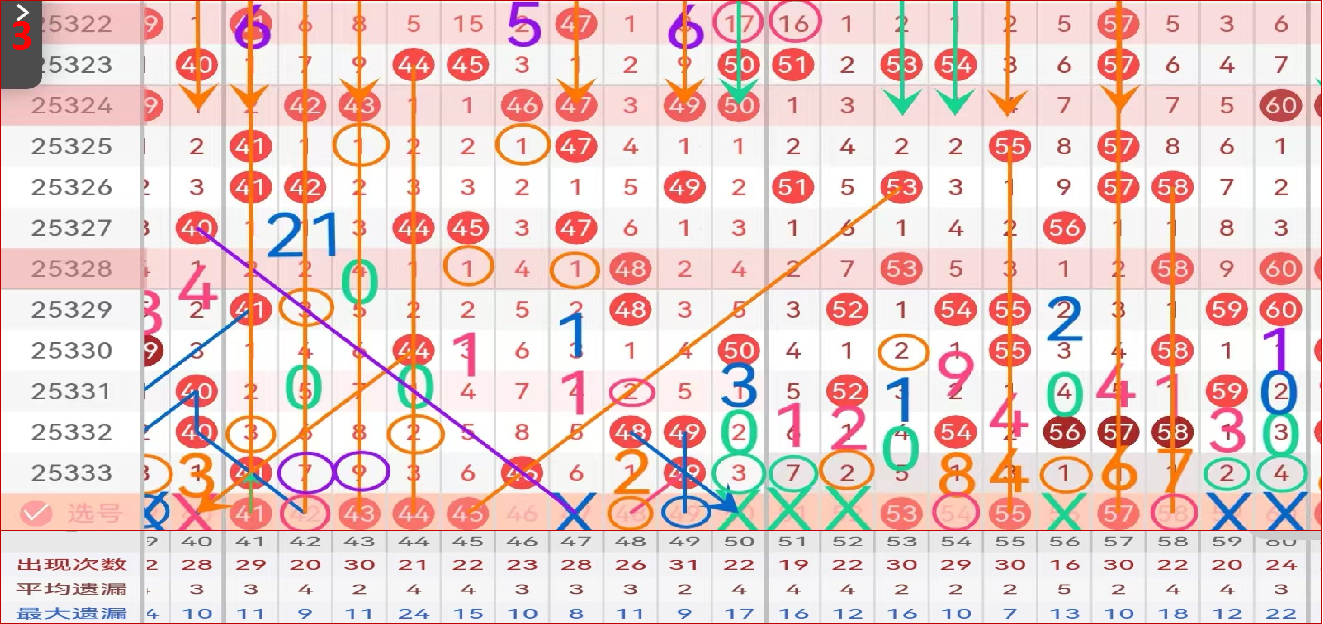 三区间推荐主做号码:41 43 44 45 53 55 57;防守号码:42 48 54 58;
