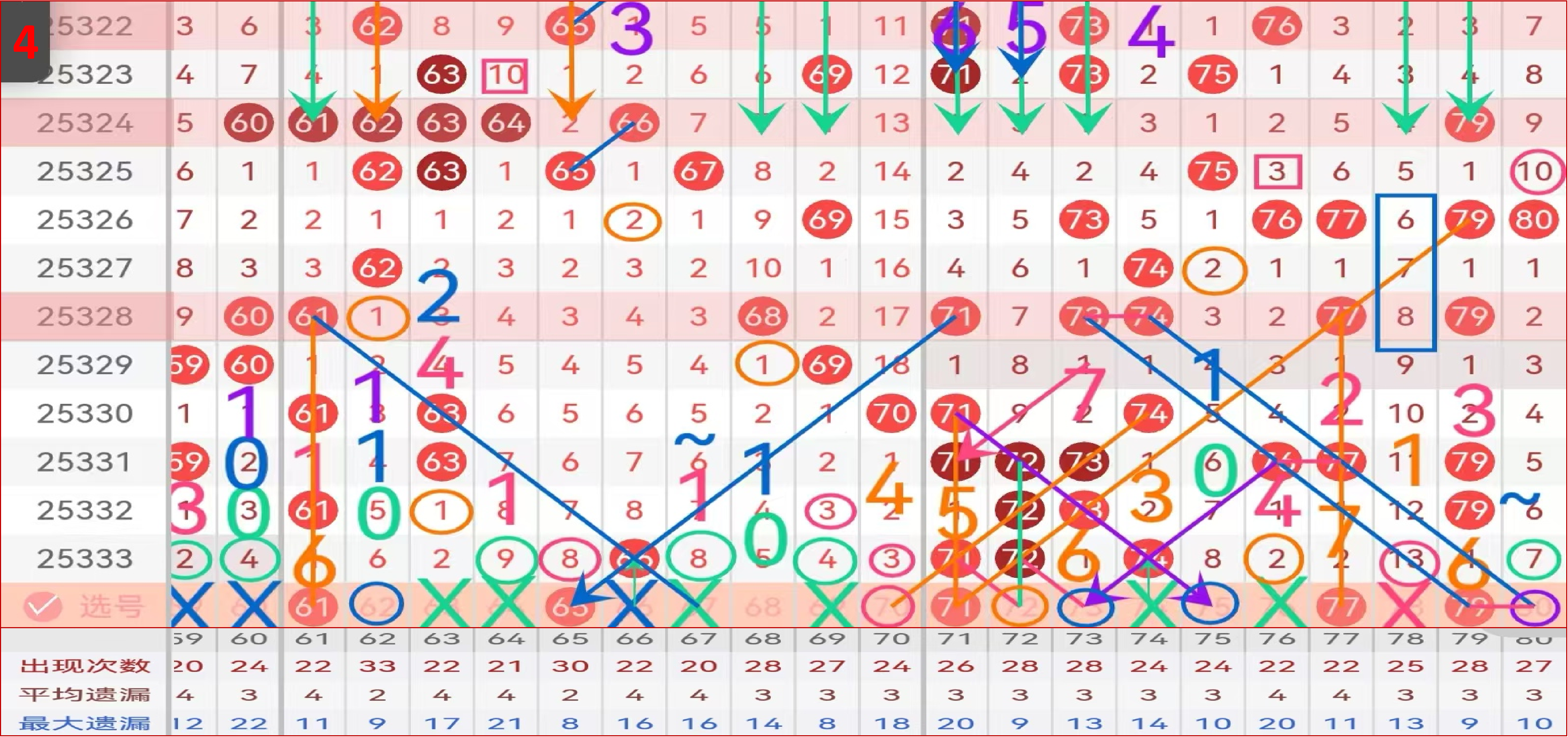 四区间给到主做号码球:61 65 71 77 79;防守号码:32 70 72;