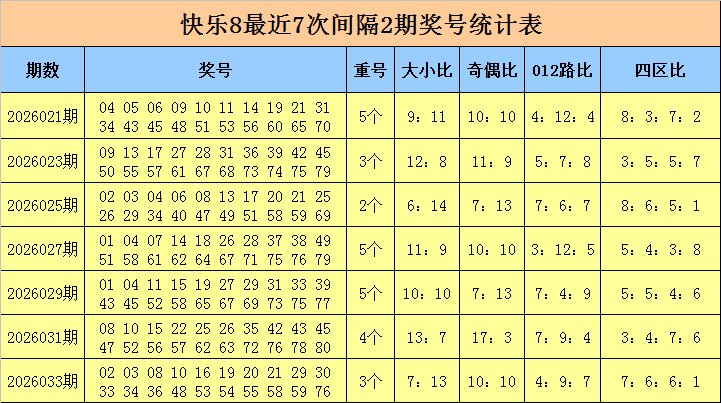 冷温热码分析:在快乐8分析中,我们一般把遗漏0-2期的号码称为热码,遗漏3-6期的号码称为温码,遗漏6期以上的号码称为冷码,最近7期奖号冷温热码出现个数比为214673,连续7期冷温热码理论个数比为193982,上期奖号冷温热码个数比为,1811,当期理论冷温热码个数比为3512,目前冷码有5个,温码有28个,热码有47个,本期看好冷温热码走势与理论基本一致,关注冷温热码比为1712