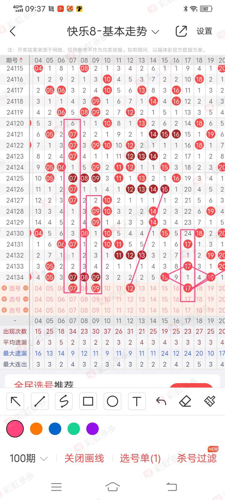 07、09号球:观察发现100期内07号球空二走重出现过3次,而近期三橫连码落位后,一般都是两边走重,以前一般都是居中走重,所以本期07、09走重一码嫌疑很大,虎心胆更偏向于09号,从9列竖格分布图中看,近期09号附近开出的球都有重码开出的现象,例如72号双重,63号三重,36号双重,上期开出09号,那么到了本期首先想到的就是09号走重,从区间上看走势上很整洁顺畅,何况09号球作为遗漏4期号码开出,而近期遗漏4期号码有走重惯例,同时09号走重后与上面09号双重形成对应形态,这与上期开出的遗漏7的号码有异曲同工之处,当然虎心胆在二选一的问题上常出现偏差,大家也可以反着来选择07号球,毕竟07号球走势上也相当漂亮。