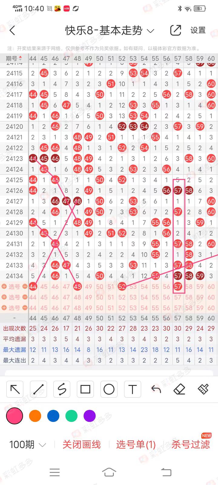 52号球:本期属于间隔四期对称号码,上期那么好的走势情况下没能落下来,本期回补的可能性很大,从基本走势上看,它走成了52-55-58-61跳空斜四连,虎心胆认为52号邻球53号就是个坑,看似上面走过53-55-57的斜连线,本期用脚的都能想到会落下53号,但往往很好的走势它就是开不出来,所以虎心胆认为52落下来的希望很大。