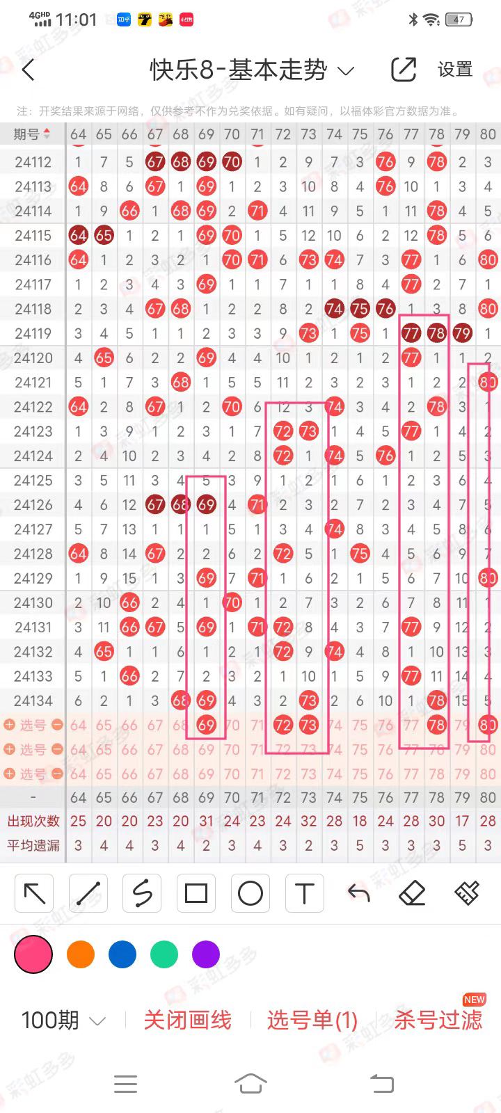 本区间号码有点古怪,从基本走势图上看,很少看到走势落位的号码,本区间虎心胆看好69、72、73、78、80五个号码球。
