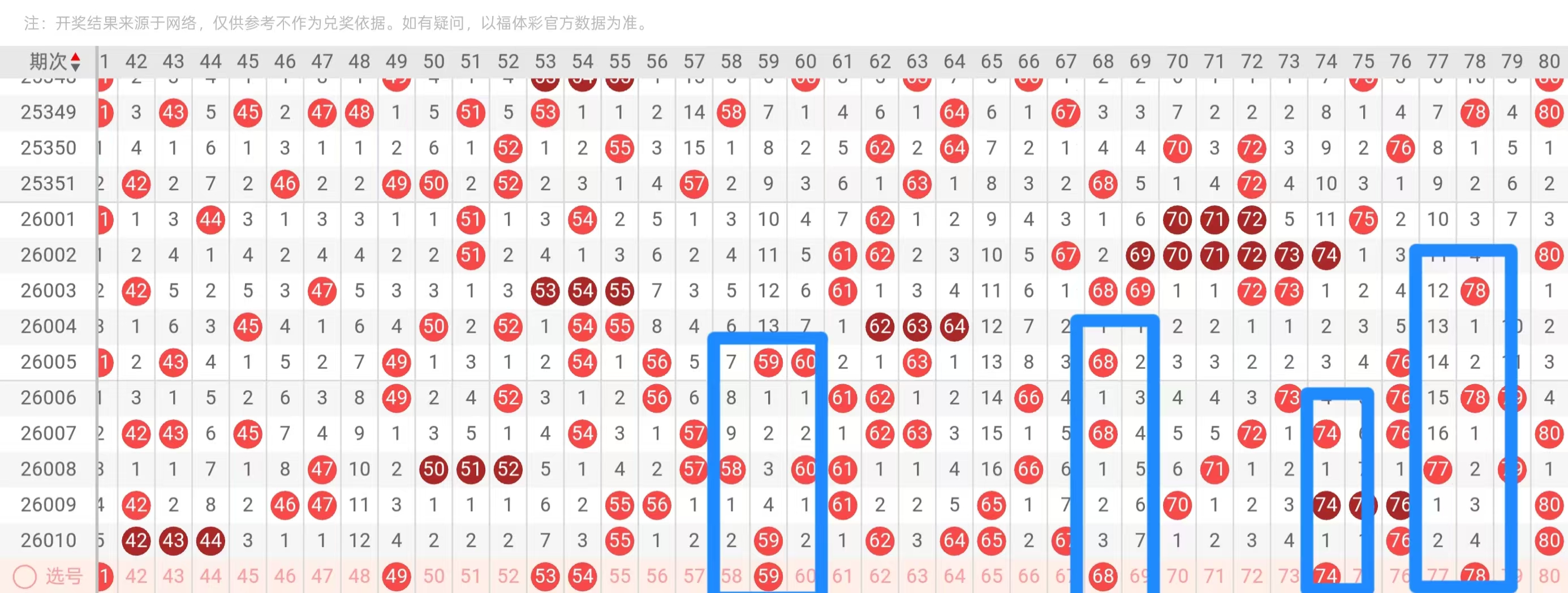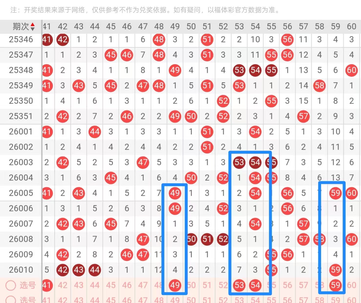 三区41—60:整个三区本期的做号情况比较明显,尤其是上次4字头给到了连号之后,这是有可能带动本期趋势的走向,因为4字头最多的时候近期都是三码。上期开出连号之后也。是三码,那么本期4字头做号的情况也比较特殊,大家正常可以关到3~4码去,主要涵盖呃正常选号的话,连号的分边至少考虑一码,如果说47实在想做的话建议带上对子。字头大家需要关注的就是今天和6字头都是一个四线连,个人最看好左边四斜连以横连的情况收尾是一个不错的小优势点。