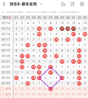 37码,遗漏间隔为8.6.2,形态为和数号,且如上图所示,与往期奖号35 39码形成一个正方形,所以看好。