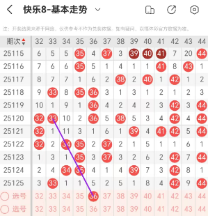 36码,如上图所示,与往期奖号33 34 35码形成一个隔1的斜4连,所以看好。