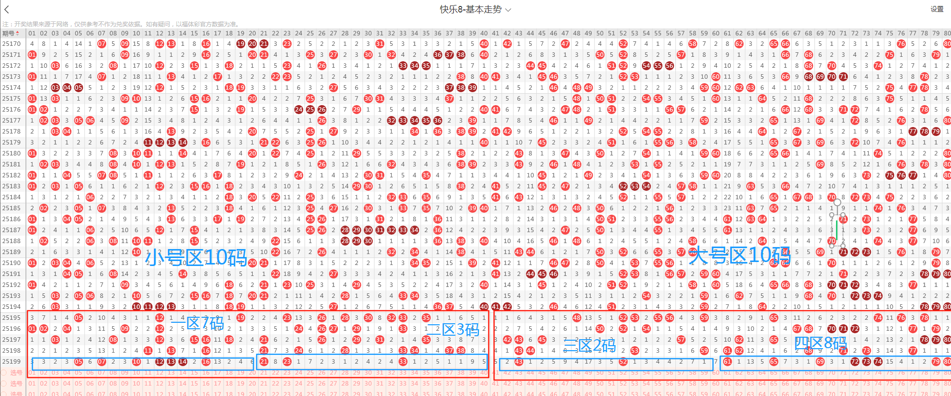 上图是快乐八2025199期区间走势图,从图中看到小号区(1-40)开出10个出奖号码,从开出数量上看与上期开出数量一致,热度延续,从小号区近10期出号情况看,整体小号区前区近期偏温趋势;大号区(41-80)本期开出了10个出奖号码,从近期出奖号码个数看属于偏温态势,下期快乐八2025200期大号区号码大概率热度反弹,大小区间主看大区号码热度反弹,大小比具体区间比可参考11:9,防10:10的比例;再从细分区间来判断,按走势图四分区分成四个区间,一区(1-20)开出来的号码有7个;二区(21-40)开出来的号码有3个;三区(41-60)开出来的号码有2个;四区(61-80)开出来的号码有8个;数据上看本期出奖号码集中分布在一、四区。从号码落位区间形态上看,快乐八2025200期主看二、三区热度回补的态势,出奖号码几率较大,需要密切关注。