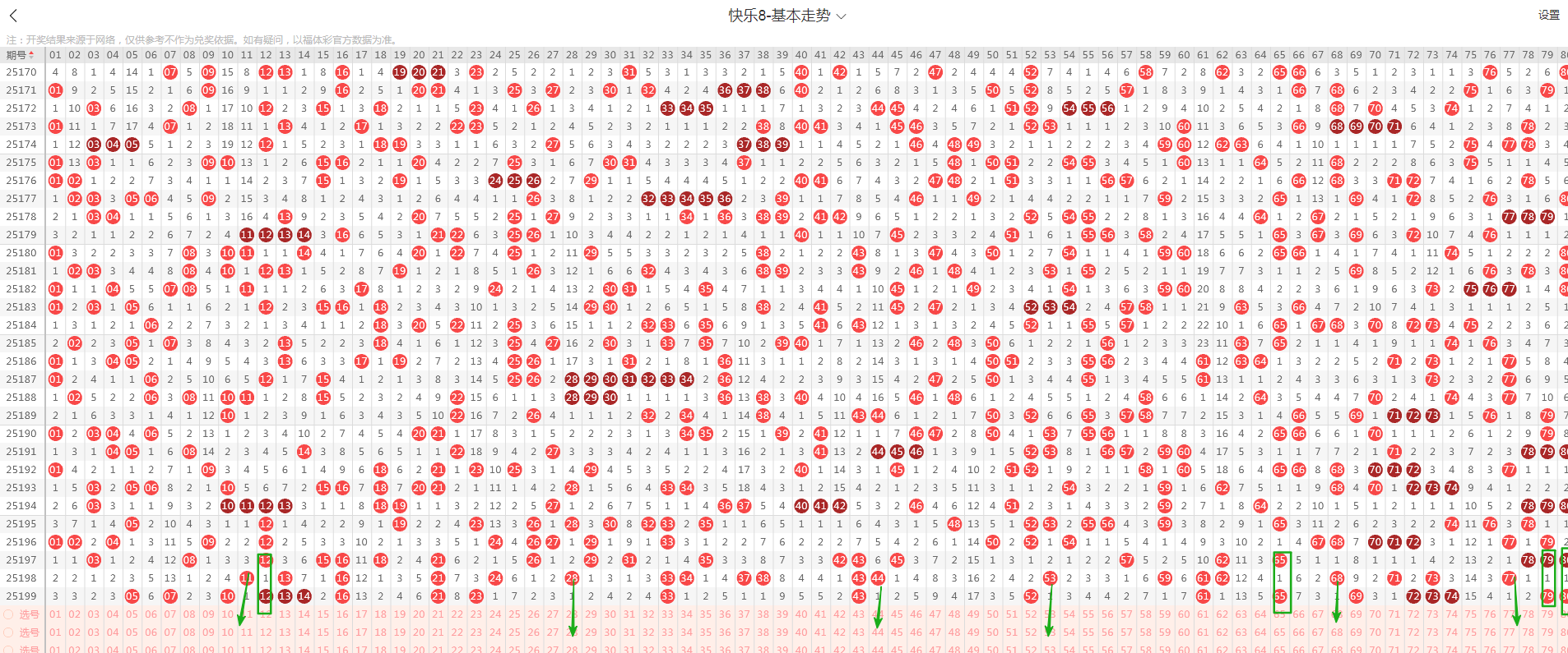 从这张走势图可以看到我画标出来了遗漏示意号码,开出了隔期(遗漏一期的)4个号码(绿色方块标示的),从近期走势图看隔期有走热态势,本期判断6个(绿色箭头标示的:11、28、44、53、68、77)需要关注,有下号概率;