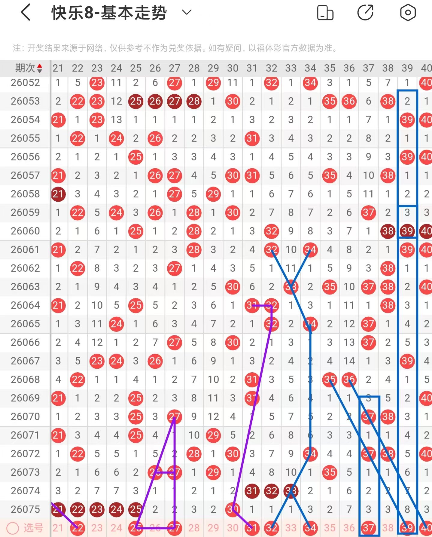 二区间大面积增加落号,一共开出六个号码球,本期考虑减少号码球的数量,注意两重码带三斜连走势回补的22号码球,直角三角形走势注意25、27号码球,注意百期相似形态的31号码球,以34号码球为对称走势起点,注意走势形态的32、34号码球,注意期数和值加减法的37、39号码球,注意阶梯落位连码走势的39、40号码球,因此二区间关注25-31-34-37-39,注意本区间的选二复式27-37-39。