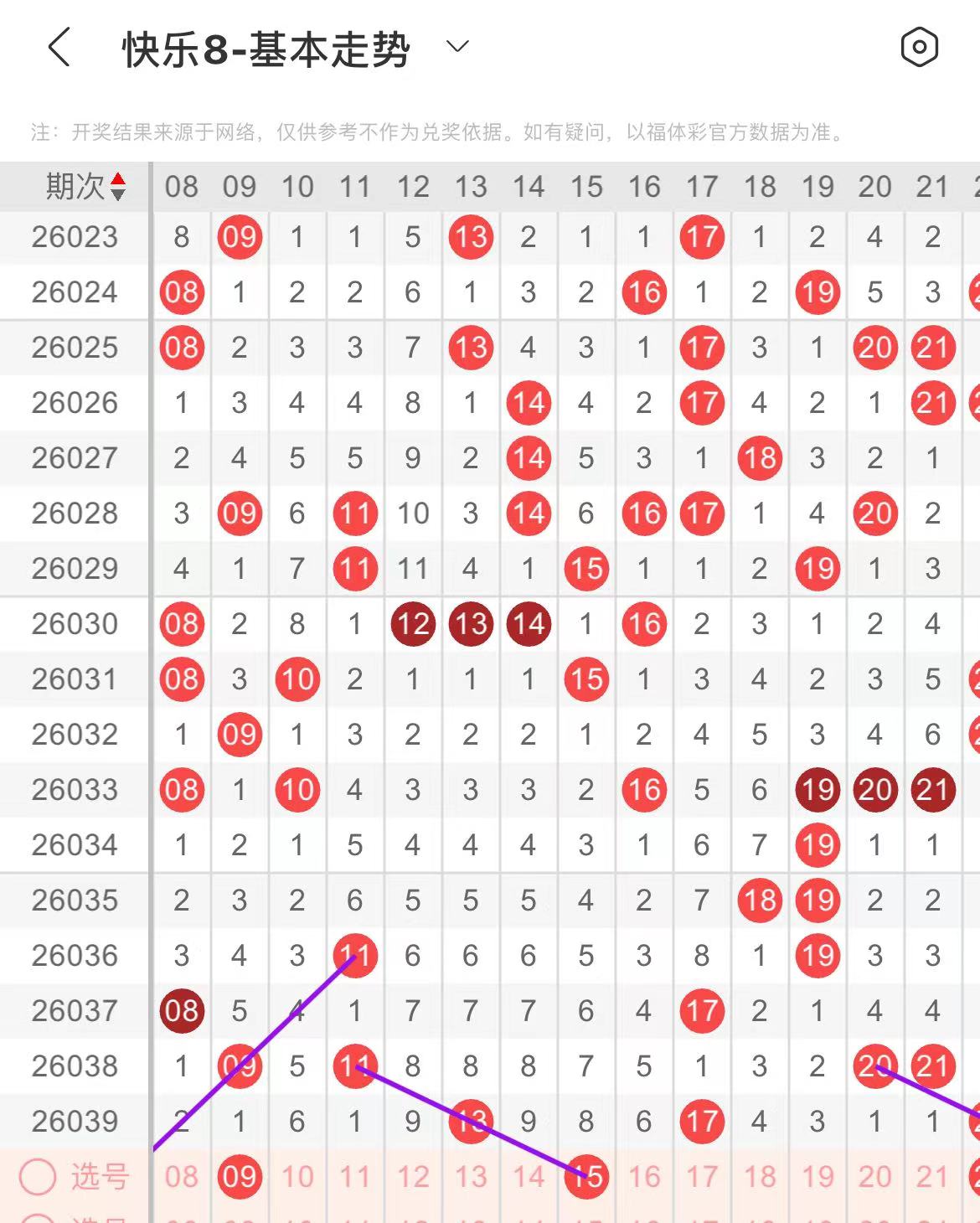 11-20区:本区间上期开出了两个号码,从号码走势图上看,该区现属于温冷区,在选号上建议以防为主,本期出号个数在一两个号码左右,有出号走势的号码有15号,斜连出号走势。