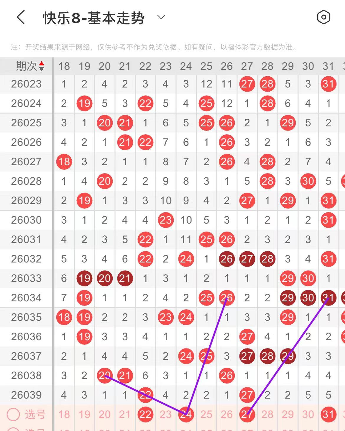 21-30区:本区间上期开出了两个号码,从号码走势图上看,该区现属于温热区,出号个数应该还能保持在三个号码左右,有出号走势的的号码有24号,双线斜连出号走势,防22.24同出,27号,走重,斜连出号走势。