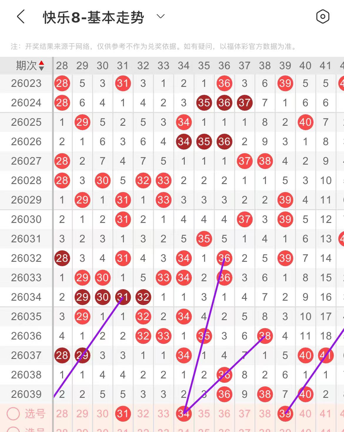 31-40区:本区间上期开出了三个号码,从号码走势图上看,本期关注后半区号码持续输出,前半区连续走空,本期注意有号码回补,出号个数在三个号码左右,有出号走势的号码有34号,双线斜连出号走势,防31.34同出的可能,39号,斜连出号走势,防37.39/35.39组合号码开出。