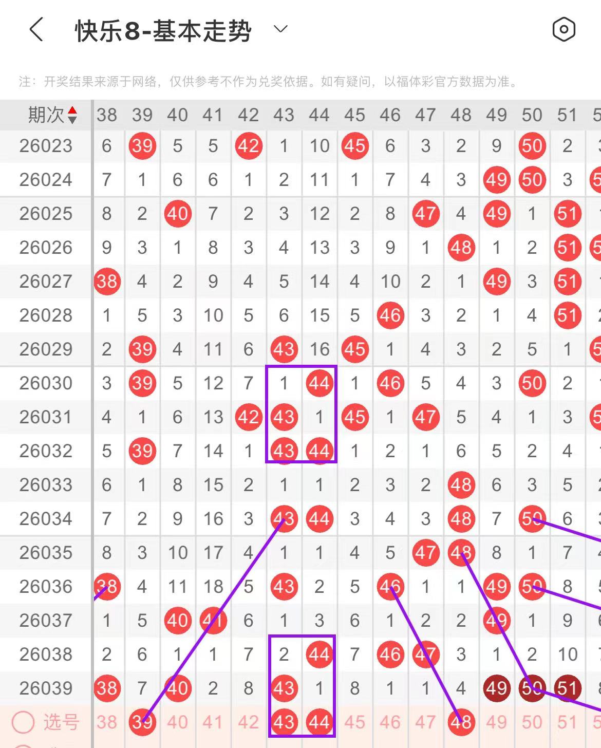 41-50区:本区间上期开出了三个号码,从号码走势图上看,该区现属于温号区,出号个数连续多期保持在三个号码左右,本期出号个数变化应该不是很大,有出号走势的号码有43.44号,同出,复制上面走势形态出号,48号,平行斜线出号走势。