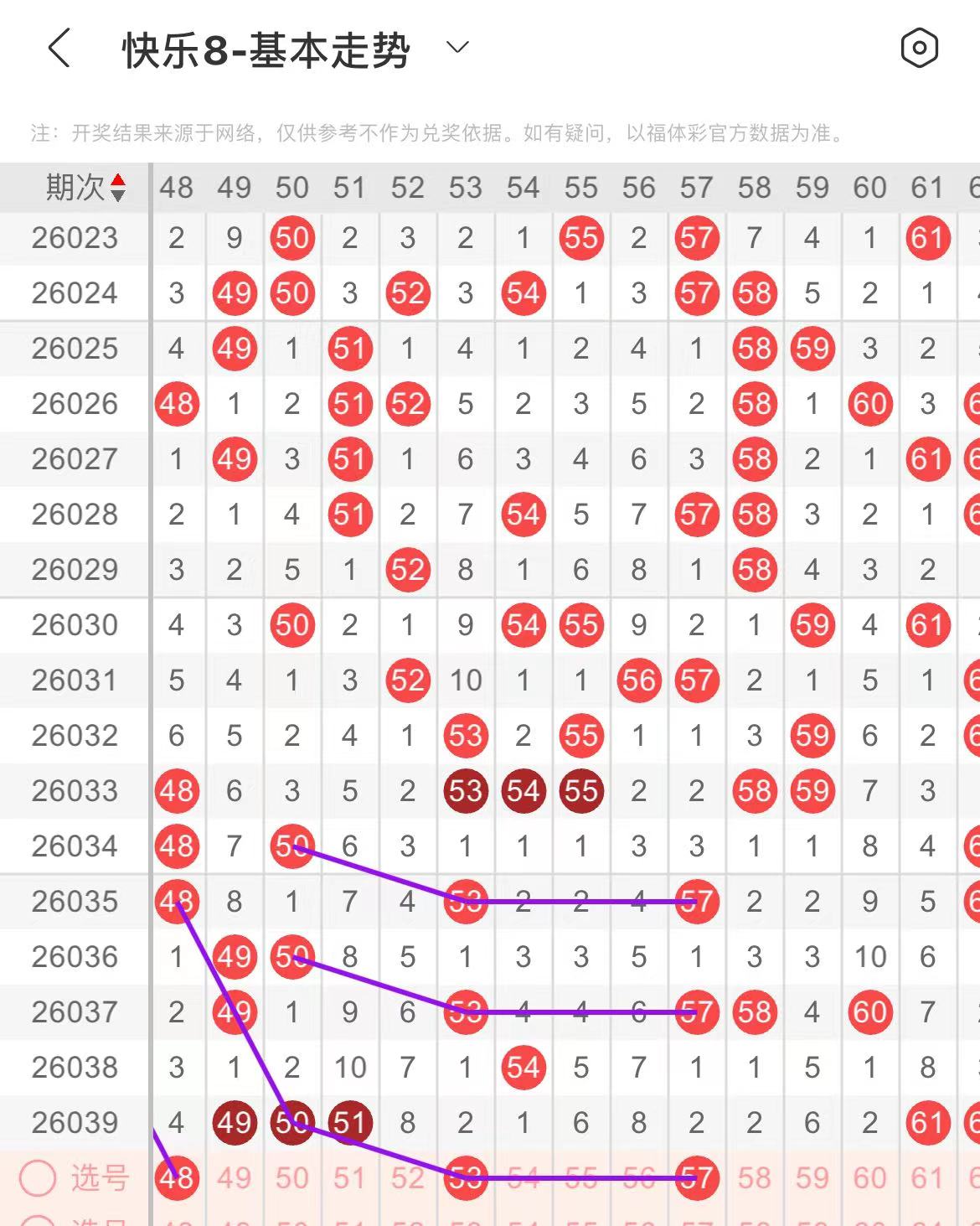 51-60区:本区间上期开出了一个号码,从号码走势图上看,该区现属于温冷区,出号个数在一两个号码左右,有出号走势的的号码有53号,50对应53出号走势,防53.57同出。