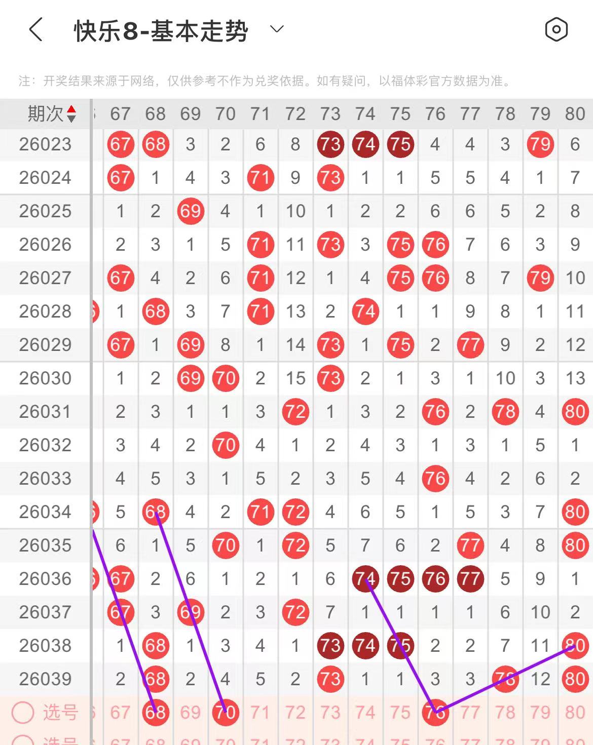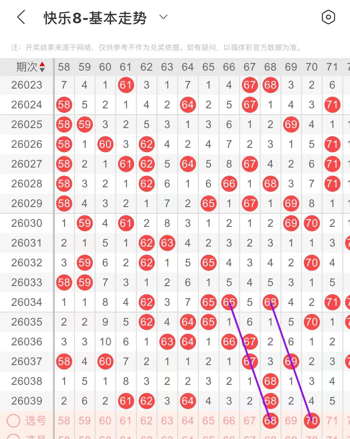61-70区:本区间上期开出了四个号码,从号码走势图上看,本期重点关注后半区号码回补,出号个数在两个号码左右,有出号走势的号码有68.70号,平行斜连出号走势。