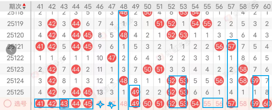 第三区间的走势分析:第三区间上期开出了六个号码球!主要的落号点位在四区间的前半区和后半区的龙头附近。根据三区间的走势规律!如果今天三区继续走热,我们首先关注四区间的41到45之间的落号以及49到55之间的落号!如果三区间今天走冷,我们主看热码的边码以及夹码和冷码的回。补。防守41 50 55 57 59 60大约会有1-2码落下,以及46 47的落位。