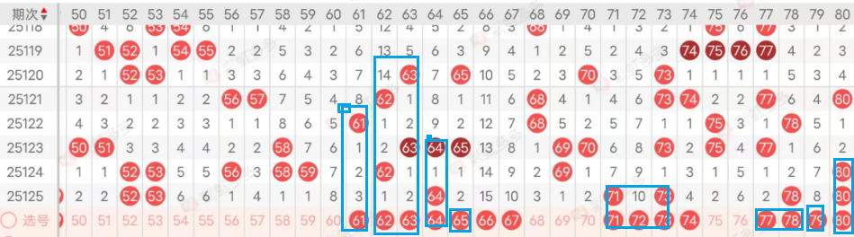 第四区间的走势分析:第四区间上期开出了五个号码球!主要的落号点位在后半区!根据四区间的走势规律!今天的四区间我们首先关注龙头凤尾和中间位置。特别是龙头重点关注。然后关注71 73这个点位!主看它的边码 夹码,防一码走重。73和78这两个点位的边码有号!它们两个应该有一码走重。凤尾79如果落下后半区的号码就不多!防80上三楼。