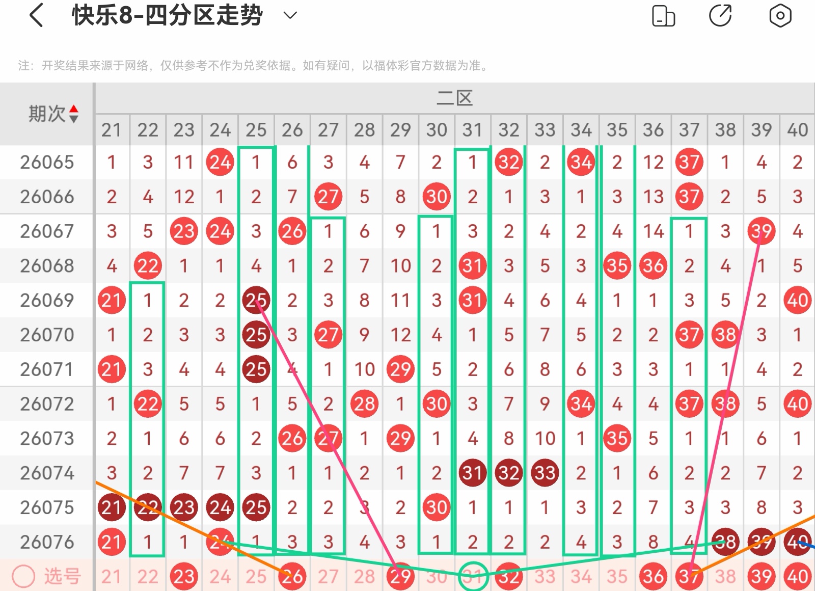 上期开出码,区间平稳,本区防3-5码开出。上期重号开出两码本期重号防一码开出,注意39.40开出重码的可能大遗漏号36上期形态走势开三码,本区形态走势有:22.25.26.27.30.31.32.34.35.371-3码, 重点关注26753走势,32282走势,37314走势以及30521走势,小防22321走势以及31342走势上期空位走势开出无,本区空位走势有:空二22.23,空十三中心号31,共三码防上期斜连走势开出,本区斜连走势有三斜连23.25.39,共三码防本区注意重号、连码以及空位号码,隔期号码回补开出。