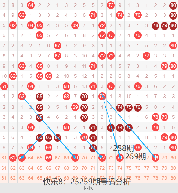回顾25258期开奖号码:01 05 10 12 16 23 25 28 29 36 40 46 51 55 58 64 66 71 76 80 ,最近一段时间号码爆区几率特别高,目前已经连续多次出现爆区热开的情况,爆区之后基本上都是迅速回调,转换至其他区间继续暴热,大家若是能抓准区间,或许有很大的机会,但是号码的变盘规律是非常的快,很难把握,个人建议谨慎选择,不要 盲目的去操作~~