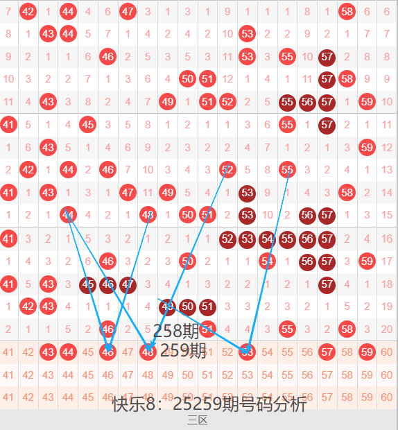 上期该区间开出号码:46 51 55 58,4个号码球,区间呈现温冷开,区间整体上目前是在热开的周期,号码出号近期也比较平均,分布相对与其他大区间来说很均衡,本期二区间个人预选号码:43 44 46 48 53 57 59,43号是遗漏1期的号码,44号是遗漏5期的号码,46号本期看重码的机会,双线斜连的夹角落位点,48号是遗漏5期的号码,也是双线斜连的夹角落位点,53号是遗漏4期的号码,双线斜连的夹角落位点,57号是遗漏2期的号码,59号是遗漏3期的号码,通过以上分析,三区间终选号码:43 44 46 48 53 57。
